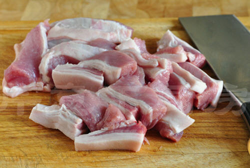 2、猪肉切成块儿备用(四肥六瘦、三肥七瘦、二肥八瘦,随意;反正全瘦肯定不好吃!);