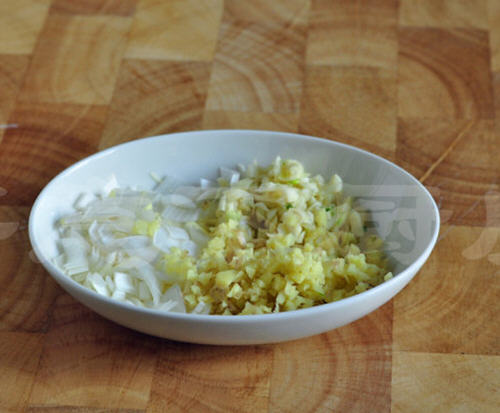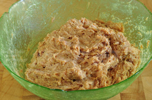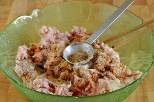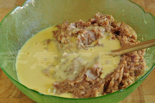 搅拌:调味料放入肉糜后,用手抓匀,沿着同一个方向,快速搅拌,1茶匙水分成2次加入,一面加水一面搅拌至水分被肉吸收,将肉糜搅打上劲儿。 这样能进一步加强肉糜的黏性。