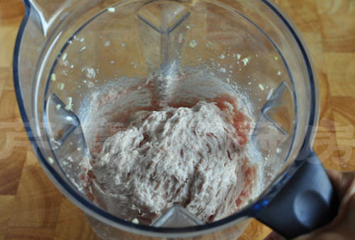 3、将肉块儿和葱姜蒜一起放入料理机,打成肉泥;(没有料理机或要更有质感、吃到肉粒,可以将肉与葱姜蒜剁剁剁……再用刀背砸砸砸……成泥。)
