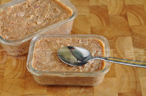 8、将拌好的肉馅铺入耐热容器中,铺到满,并抹平压实;(选小一些的容器比较好,分次吃,容易保存。)容器内事先抹一层薄油,方便脱出。