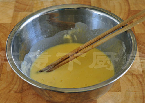 5、面粉、淀粉,鸡蛋,清水一起放入大碗,搅拌至均匀细腻;