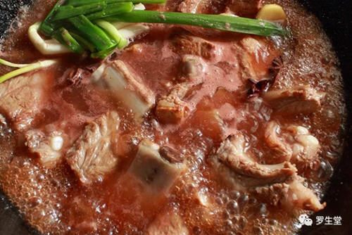 6、放热水刚漫过排骨,把葱姜放下去,大火烧开,盖锅盖小火烧一个半小时左右收汁即可