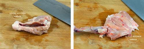 第二步:开始处理鸡腿。用刀将鸡腿的脚踝处切断,露出骨头,如图。
