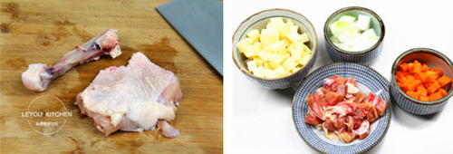 第六步:把鸡肉切块(减肥的朋友,可以把皮去掉),土豆去皮切块,胡萝卜切块、洋葱切块。