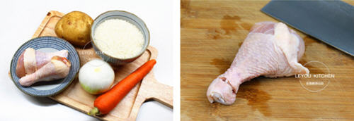 第一步:准备食材。鸡腿2个、土豆1个、胡萝卜1个、洋葱半个、米300克。