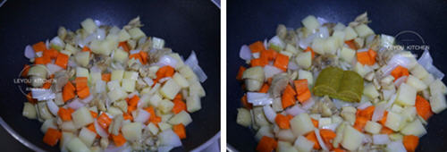 第九步:把土豆和萝卜放入锅中煸炒均匀。