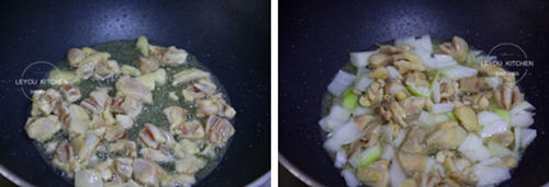 第七步:锅中倒入适量的油,油热后把鸡肉放入锅中煸炒至变色。