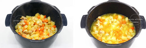 第十步:把咖喱块放入锅中,再放入1勺盐、两勺糖调味。