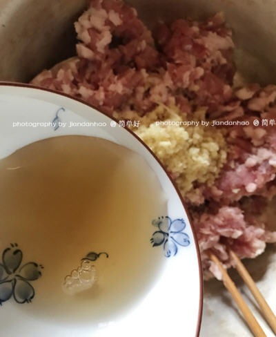 4、肉馅里加入姜末和两勺料酒,搅拌均匀后分次少量加一些水,打水后的肉馅口感会更嫩。