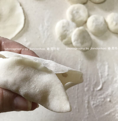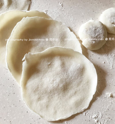 10、将小剂子擀成四周薄中间稍厚的饺子皮。