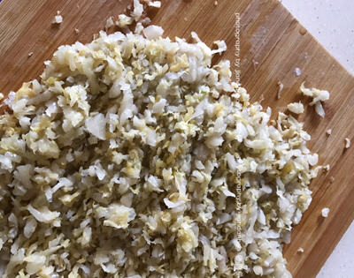 7、酸菜350克挤净水分切成碎粒,加入到肉馅中,搅拌成酸菜馅,之前肉馅里已经放了足够的盐和蚝油,加入酸菜后不用再加盐了。