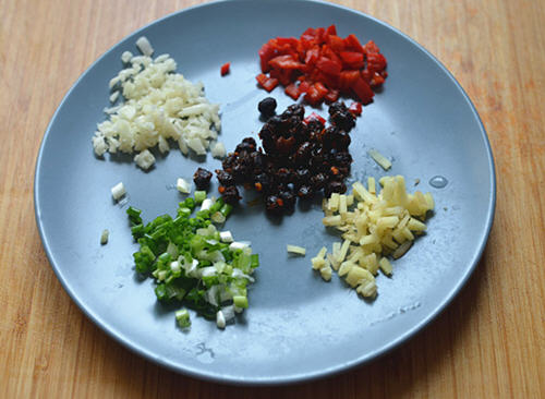 配料:料酒1勺,豆豉1勺,蚝油1勺,盐适量,生抽2勺,细砂糖1小勺,胡椒粉少许,生粉1勺,红椒半个,香葱2