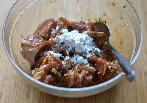 5. 搅拌均匀后腌15分钟后加入生粉拌匀。