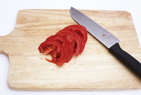 4、把西红柿切成薄片。