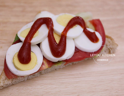 6、取一片面包,依次放上生菜,西红柿片,鸡蛋片,再挤上少许番茄酱,然后盖上面包片,这样依次把整个三明治做好。