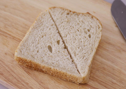 5、把面包片放入烤箱或者多士炉中加热,然后切开,如图。