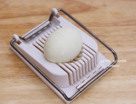 3、把鸡蛋切成薄厚均匀的片,如图。