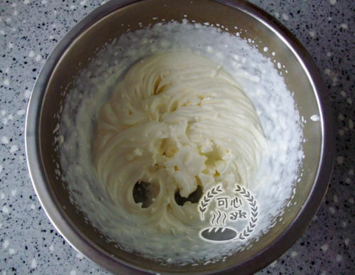 6、等咖啡凝固后,称量好5克糖和淡奶油,打发至有纹路状态后装入裱花袋中备用。