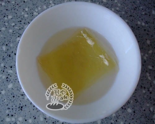 4、在一个碗中取适量凉白开,将吉利丁片放入其中泡至软。