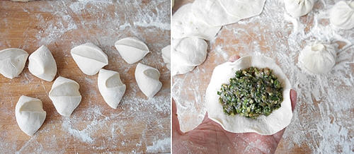 9、擀成中间厚四边薄的面皮,放入肉馅包成包子的样子。每个人放馅的量不同,我所列的食材只是我的用量,您根据自已的实际情况而变通。