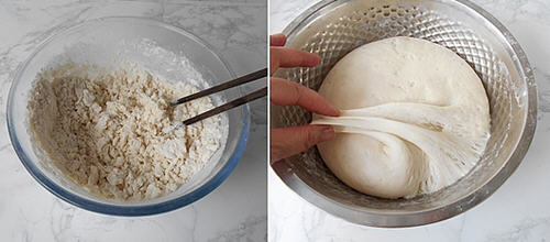 6、温水溶解酵母,面粉中分多次加入酵母水,揉成光滑的面团,如果想一会就用,就让它直接发酵,如果隔几个小时再用,那就放冰箱。
