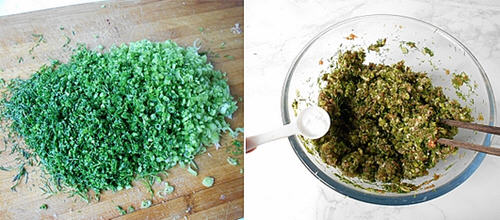 5、等面都准备好,要开始包时,我们再将茴香和肉馅加入盐、植物油调匀。如果是提前准备好馅,放冰箱也别拌起来,一定要包前再拌,以免茴香的汤汁被盐杀出来。
