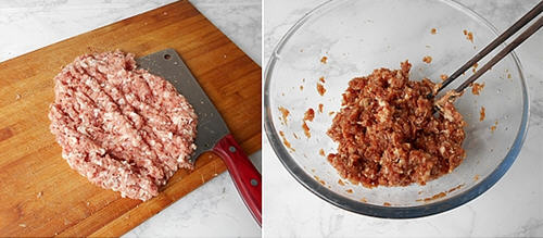 2、将肉剁成馅。因为茴香喜油,所以肉最好用三七肥瘦的。您也可以买现成的肉馅,但我总感觉自已剁的更好吃。