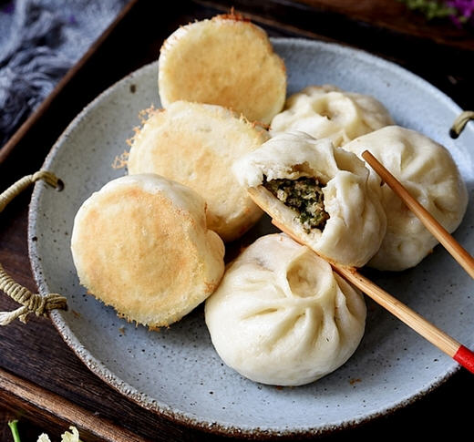 这种包子好处就是你想做的馅多大都可以,我经常把包子皮塞得都透明,吃起来超过瘾。煎好的包子,底壳金黄焦脆,馅料自已可以随心所欲,素的肉的,随着季节的变化用不同的时令菜蔬。如果出锅时再撒点香葱芝麻,那更是美上加美。