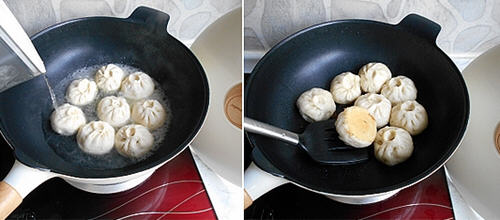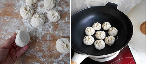 11、平底锅加一大勺油烧热,把生煎包沾一下面粉后,摆放在锅内。