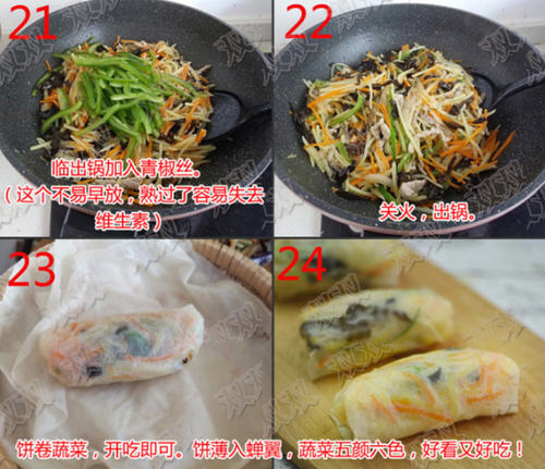 5、饼卷的蔬菜,要五颜六色才好看,自饼里面透出来,营养也更加丰富哦!