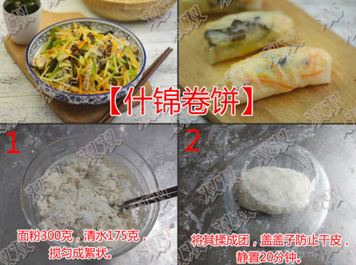 薄如蝉翼的饼什锦卷饼制作时不要用烫面,要用冷面来做,饼多层摞一起,一定要多抹油才不会粘,擀饼的时候注意,擀几下翻一下面受力均匀才会薄厚一致,要让卷饼好看,可以把蔬菜多放一些颜色,这样才更加漂亮。