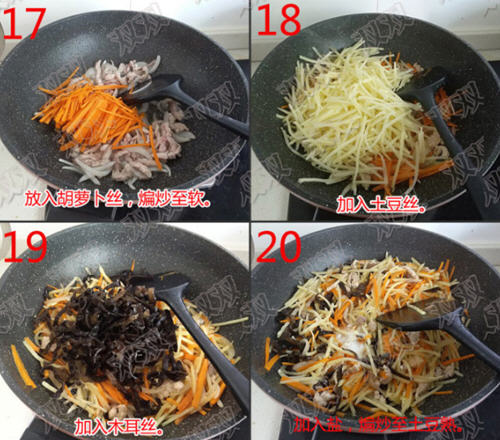 16、炒锅烧热。倒油。放洋葱炒出香味,加猪肉丝。煸炒至颜色变自。