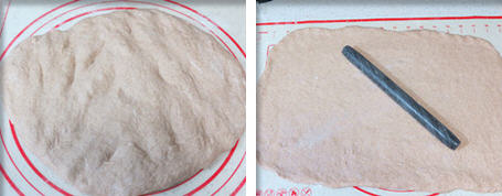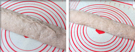 13、将整成圆柱体的面团用刮刀纵向剖切,分成两半将切面朝上,注意面团的一端不要切断