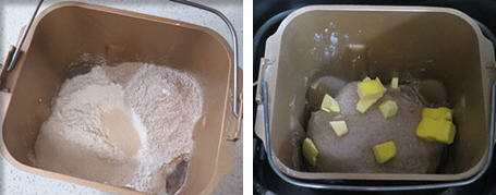 3、将面团材料除黄油外按先液体后粉类秩序放入面包机桶内