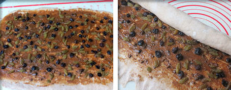 9、在面片上均匀涂满肉桂红糖酱,均匀撒上沥干液体的水果干,底部收口处留出一部分不放馅料,并压薄底边