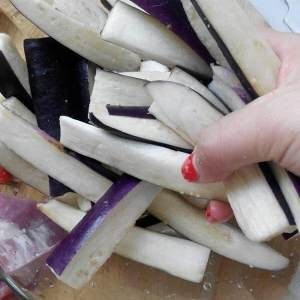 2、用手抓匀腌制十几分钟。这一步很重要,因为这样处理了茄子不氧化变色