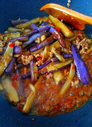 12、肉沫变白以后茄子回锅翻炒一下