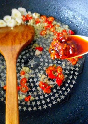 10、锅里留油下姜蒜炒香,并加入适量郫县豆瓣酱。