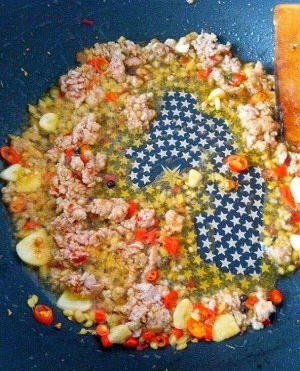 11、豆瓣酱炒香以后下肉沫翻炒