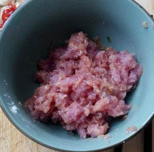 4、肉馅里面加入白胡椒粉适量,生抽适量。料酒适量,生粉适量抓匀腌制十分钟,别说那么一点肉你不想腌制,不要偷懒,除非你想一盘好菜吃出腥味儿!