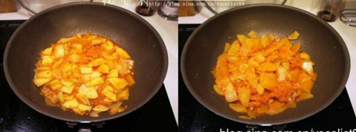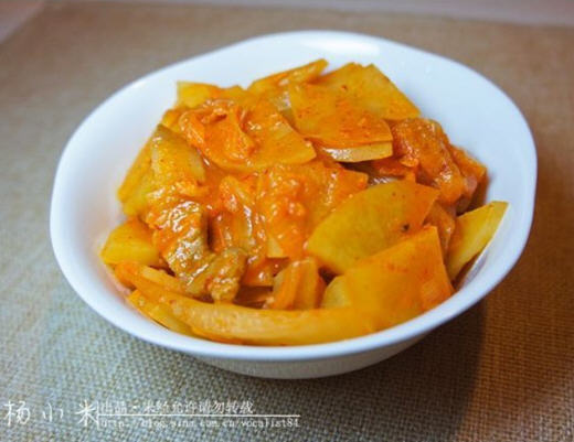 4、待锅内汤汁基本收干时用1汤匙水调匀韩式辣酱后倒入锅内,加盐翻炒均匀即可。