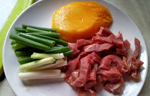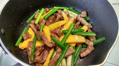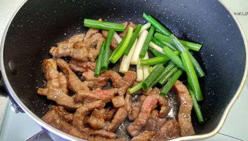2、起锅,放入2大匙油,将牛肉条炒七分熟,加入酱油1小匙、酒、糖及葱拌炒。