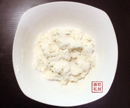 3. 徐徐调入温水,一边调入水一边顺一个方向搅拌成大块絮状时用手揉成面团。