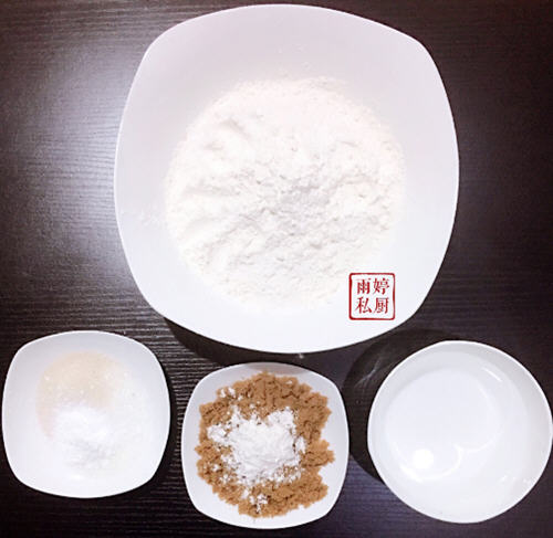 1. 提前备好所需材料。注:红糖里加入2g面粉和匀,备用。