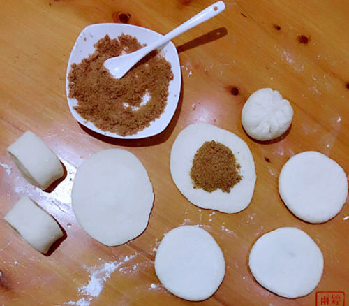 6. 取面团揉光滑,分成均匀的小面剂子,擀成面皮,包入红糖馅,像包包子一样包好收口,封口朝下稍稍擀平即可。