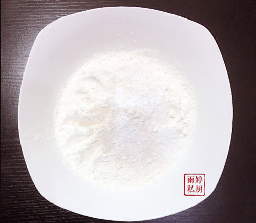 2. 将酵母粉、泡打粉、糖撒入面粉中搅拌均匀。