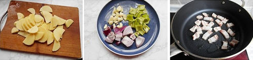 5、煎肉时,我们另用一锅,将土豆片焯一下,变色即可捞出。别煮的火太大。煮过后,我们接下来煎制就省事了。