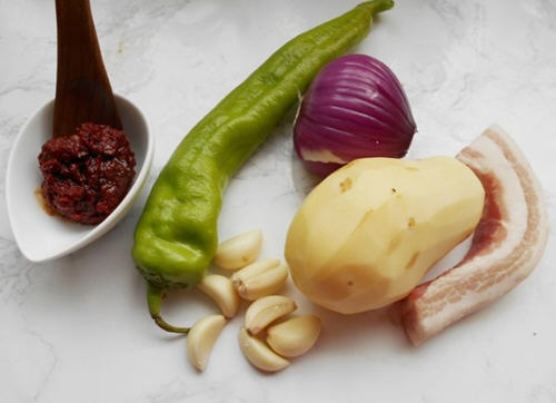 土豆1个、五花肉100克、郫县豆瓣酱1大勺、洋葱1/4个、青椒1个、蒜6粒