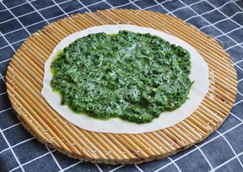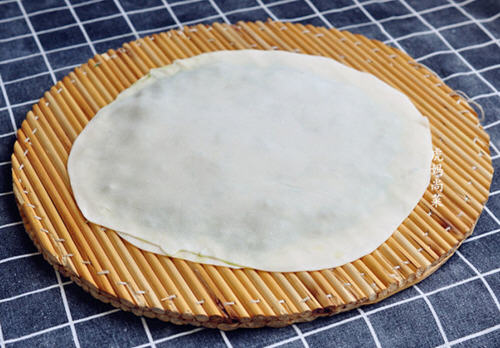 5、将一张擀好的饼皮放盖帘上,再将加盐拌匀的馅料铺满,摊匀。