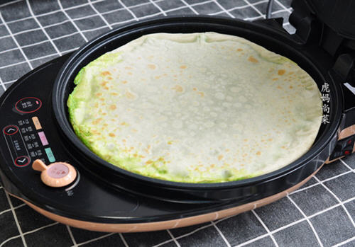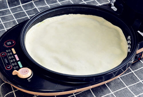 7、然后放入预热好的电饼铛里,盖上盖子,用自主烹饪键开始烙制。